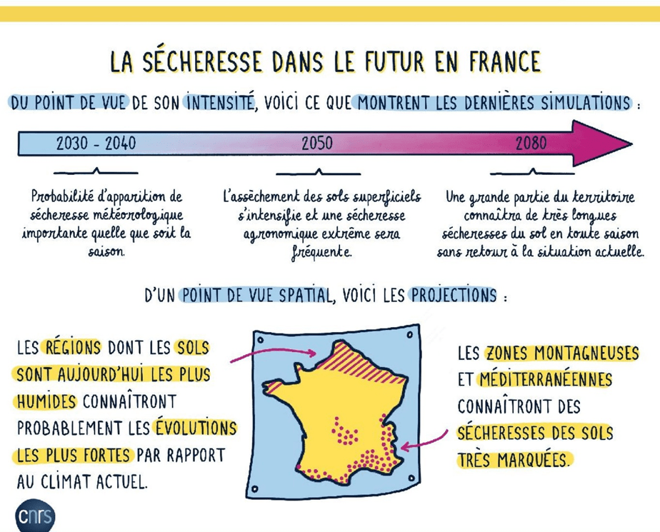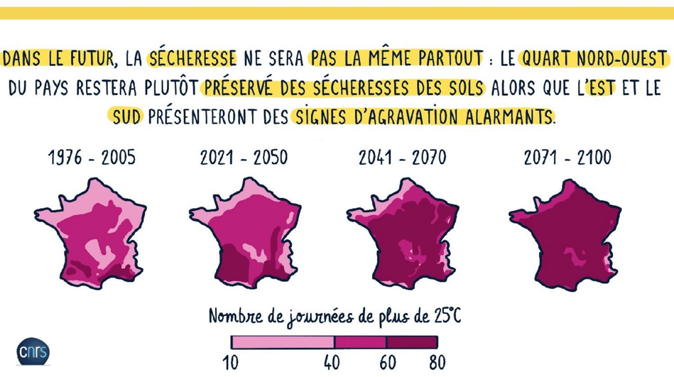Il n’est pas possible de reprendre ici toute la richesse de l’exposé d’Antoine PETIT. Cependant, après les incendies importants en France et même en Bretagne au cours de l’été dernier, nous avons retenu les projections d’ici la fin du siècle concernant la progression de la sècheresse, elles sont particulièrement éclairantes dans les 2 tableaux suivants :